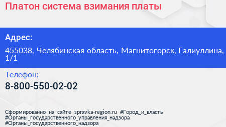 Платон, система взимания платы по адресу 455038, Челябинская область, Магнитогорск, Галиуллина, 1/1 в дальнейшем Организация, размещена в следующих категориях: