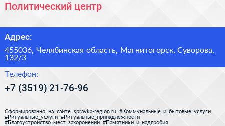 Политический центр по адресу 455036, Челябинская область, Магнитогорск, Суворова, 132/3 в дальнейшем Организация, размещена в следующих категориях:
