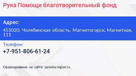 Рука Помощи, благотворительный фонд по адресу 455020, Челябинская область, Магнитогорск, Магнитная, 111 в дальнейшем Организация, размещена в следующих категориях: