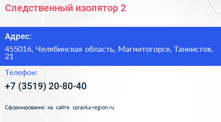 Следственный изолятор №2 по адресу 455016, Челябинская область, Магнитогорск, Танкистов, 21 в дальнейшем Организация, размещена в следующих категориях: