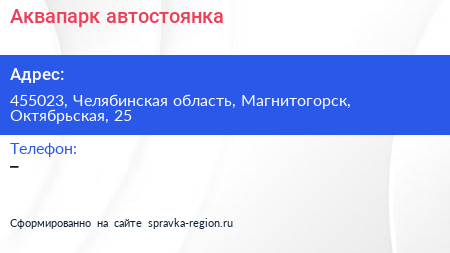 Аквапарк, автостоянка по адресу 455023, Челябинская область, Магнитогорск, Октябрьская, 25 в дальнейшем Организация, размещена в следующих категориях: