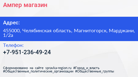 Ампер, магазин по адресу 455000, Челябинская область, Магнитогорск, Марджани, 1/2а в дальнейшем Организация, размещена в следующих категориях: