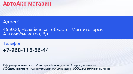 АвтоАкс, магазин по адресу 455000, Челябинская область, Магнитогорск, Автомобилистов, 8д в дальнейшем Организация, размещена в следующих категориях: