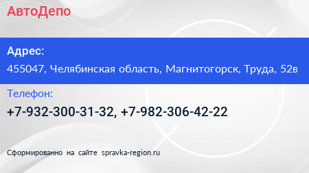 АвтоДепо по адресу 455047, Челябинская область, Магнитогорск, Труда, 52в в дальнейшем Организация, размещена в следующих категориях: