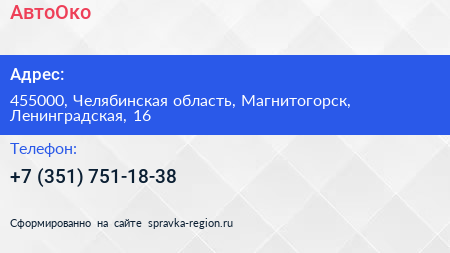 АвтоОко по адресу 455000, Челябинская область, Магнитогорск, Ленинградская, 16 в дальнейшем Организация, размещена в следующих категориях: