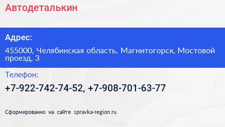 Автодеталькин по адресу 455000, Челябинская область, Магнитогорск, Мостовой проезд, 3 в дальнейшем Организация, размещена в следующих категориях: