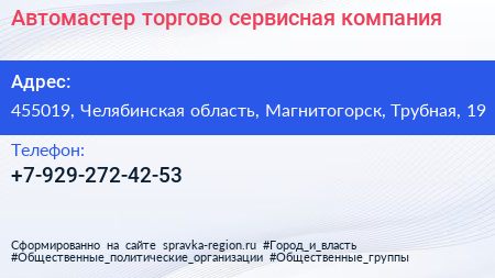 Автомастер, торгово-сервисная компания по адресу 455019, Челябинская область, Магнитогорск, Трубная, 19 в дальнейшем Организация, размещена в следующих категориях: