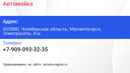 Автомойка по адресу 455000, Челябинская область, Магнитогорск, Электросети, 45а в дальнейшем Организация, размещена в следующих категориях: