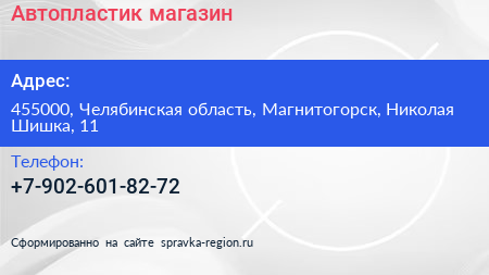 Автопластик, магазин по адресу 455000, Челябинская область, Магнитогорск, Николая Шишка, 11 в дальнейшем Организация, размещена в следующих категориях: