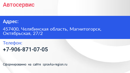 Автосервис по адресу 457400, Челябинская область, Магнитогорск, Октябрьская, 27/2 в дальнейшем Организация, размещена в следующих категориях: