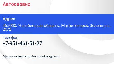 Автосервис по адресу 455000, Челябинская область, Магнитогорск, Зеленцова, 20/1 в дальнейшем Организация, размещена в следующих категориях: