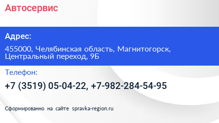 Автосервис по адресу 455000, Челябинская область, Магнитогорск, Центральный переход, 9Б в дальнейшем Организация, размещена в следующих категориях: