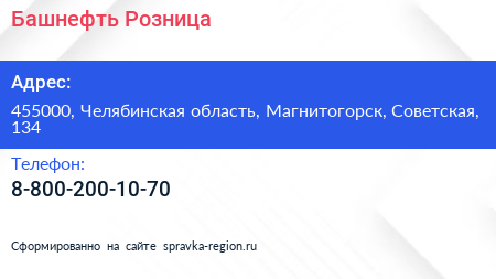 Башнефть-Розница по адресу 455000, Челябинская область, Магнитогорск, Советская, 134 в дальнейшем Организация, размещена в следующих категориях: