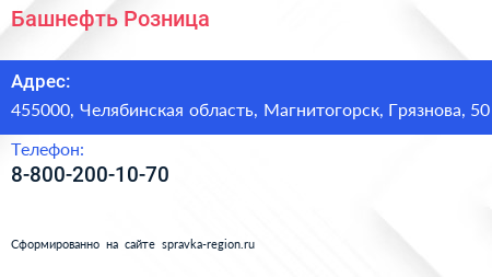 Башнефть-Розница по адресу 455000, Челябинская область, Магнитогорск, Грязнова, 50 в дальнейшем Организация, размещена в следующих категориях: