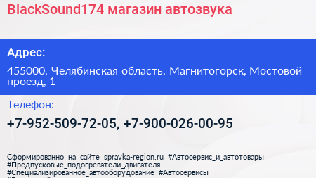 BlackSound174, магазин автозвука по адресу 455000, Челябинская область, Магнитогорск, Мостовой проезд, 1 в дальнейшем Организация, размещена в следующих категориях: