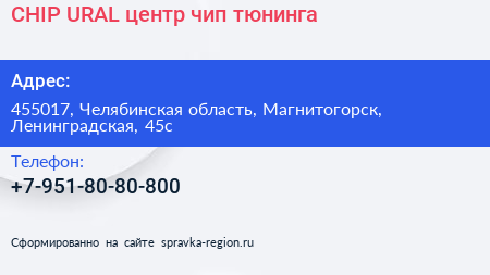 CHIP URAL, центр чип-тюнинга по адресу 455017, Челябинская область, Магнитогорск, Ленинградская, 45с в дальнейшем Организация, размещена в следующих категориях: