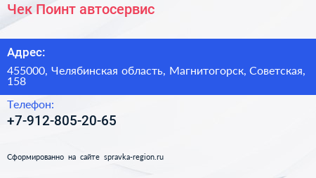 Чек Поинт, автосервис по адресу 455000, Челябинская область, Магнитогорск, Советская, 158 в дальнейшем Организация, размещена в следующих категориях:
