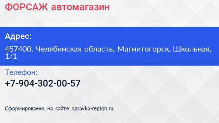 ФОРСАЖ, автомагазин по адресу 457400, Челябинская область, Магнитогорск, Школьная, 1/1 в дальнейшем Организация, размещена в следующих категориях: