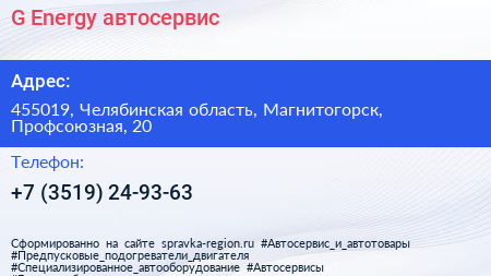 G-Energy, автосервис по адресу 455019, Челябинская область, Магнитогорск, Профсоюзная, 20 в дальнейшем Организация, размещена в следующих категориях: