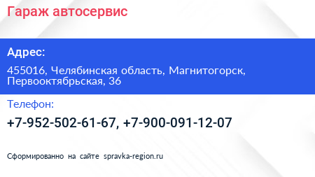 Гараж, автосервис по адресу 455016, Челябинская область, Магнитогорск, Первооктябрьская, 36 в дальнейшем Организация, размещена в следующих категориях: