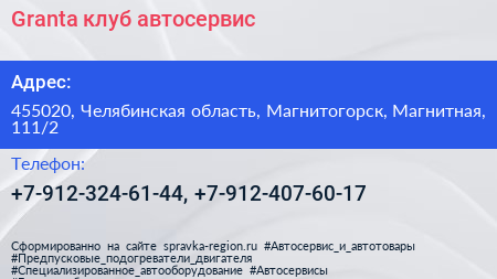 Granta клуб, автосервис по адресу 455020, Челябинская область, Магнитогорск, Магнитная, 111/2 в дальнейшем Организация, размещена в следующих категориях: