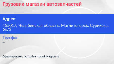 Грузовик, магазин автозапчастей по адресу 455017, Челябинская область, Магнитогорск, Сурикова, 66/3 в дальнейшем Организация, размещена в следующих категориях: