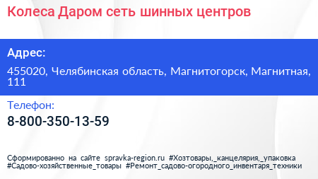 Колеса Даром, сеть шинных центров по адресу 455020, Челябинская область, Магнитогорск, Магнитная, 111 в дальнейшем Организация, размещена в следующих категориях: