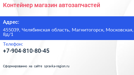 Контейнер, магазин автозапчастей по адресу 455039, Челябинская область, Магнитогорск, Московская, 8д/1 в дальнейшем Организация, размещена в следующих категориях:
