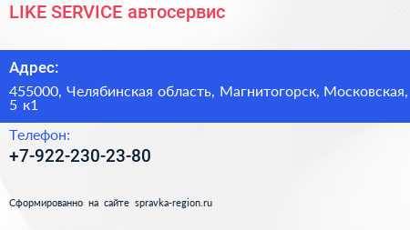 LIKE SERVICE, автосервис по адресу 455000, Челябинская область, Магнитогорск, Московская, 5 к1 в дальнейшем Организация, размещена в следующих категориях: