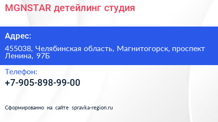 MGNSTAR, детейлинг студия по адресу 455038, Челябинская область, Магнитогорск, проспект Ленина, 97Б в дальнейшем Организация, размещена в следующих категориях: