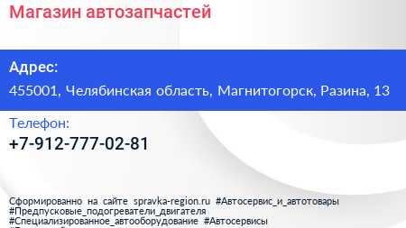 Магазин автозапчастей по адресу 455001, Челябинская область, Магнитогорск, Разина, 13 в дальнейшем Организация, размещена в следующих категориях: