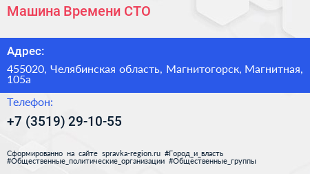 Машина Времени, СТО по адресу 455020, Челябинская область, Магнитогорск, Магнитная, 105а в дальнейшем Организация, размещена в следующих категориях: