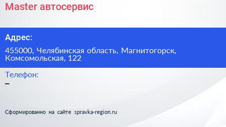 Master, автосервис по адресу 455000, Челябинская область, Магнитогорск, Комсомольская, 122 в дальнейшем Организация, размещена в следующих категориях: