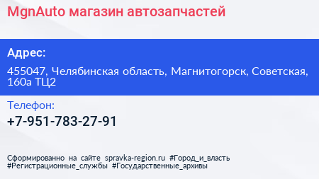 MgnAuto, магазин автозапчастей по адресу 455047, Челябинская область, Магнитогорск, Советская, 160а ТЦ2 в дальнейшем Организация, размещена в следующих категориях: