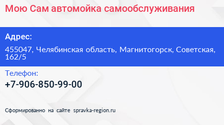 Мою Сам, автомойка самообслуживания по адресу 455047, Челябинская область, Магнитогорск, Советская, 162/5 в дальнейшем Организация, размещена в следующих категориях:
