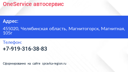 OneService, автосервис по адресу 455020, Челябинская область, Магнитогорск, Магнитная, 105г в дальнейшем Организация, размещена в следующих категориях: