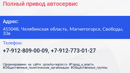 Полный привод, автосервис по адресу 455048, Челябинская область, Магнитогорск, Свободы, 33в в дальнейшем Организация, размещена в следующих категориях: