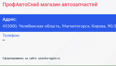 ПрофАвтоСнаб, магазин автозапчастей по адресу 455000, Челябинская область, Магнитогорск, Кирова, 90/2 в дальнейшем Организация, размещена в следующих категориях: