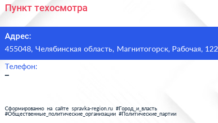 Пункт техосмотра по адресу 455048, Челябинская область, Магнитогорск, Рабочая, 122 в дальнейшем Организация, размещена в следующих категориях: