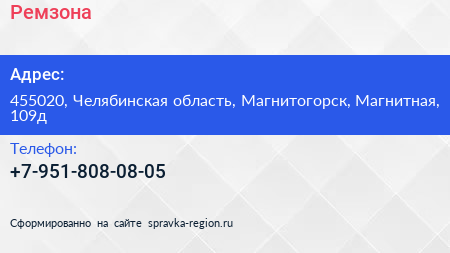 Ремзона по адресу 455020, Челябинская область, Магнитогорск, Магнитная, 109д в дальнейшем Организация, размещена в следующих категориях: