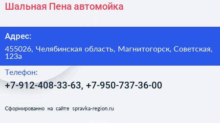 Шальная Пена, автомойка по адресу 455026, Челябинская область, Магнитогорск, Советская, 123а в дальнейшем Организация, размещена в следующих категориях: