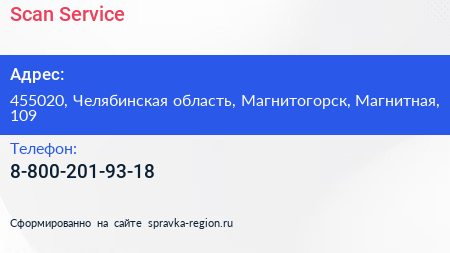 Scan Service по адресу 455020, Челябинская область, Магнитогорск, Магнитная, 109 в дальнейшем Организация, размещена в следующих категориях:
