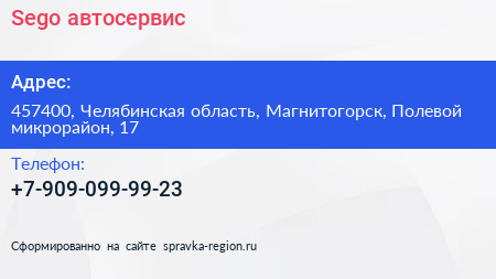 Sego, автосервис по адресу 457400, Челябинская область, Магнитогорск, Полевой микрорайон, 17 в дальнейшем Организация, размещена в следующих категориях: