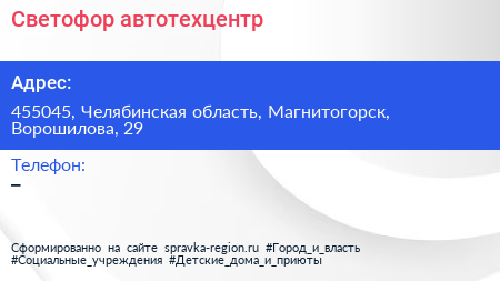 Светофор, автотехцентр по адресу 455045, Челябинская область, Магнитогорск, Ворошилова, 29 в дальнейшем Организация, размещена в следующих категориях:
