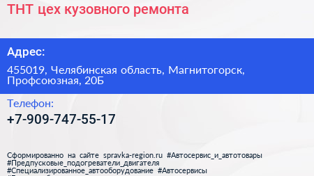 ТНТ, цех кузовного ремонта по адресу 455019, Челябинская область, Магнитогорск, Профсоюзная, 20Б в дальнейшем Организация, размещена в следующих категориях: