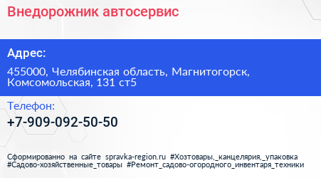 Внедорожник, автосервис по адресу 455000, Челябинская область, Магнитогорск, Комсомольская, 131 ст5 в дальнейшем Организация, размещена в следующих категориях:
