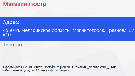 Магазин люстр по адресу 455044, Челябинская область, Магнитогорск, Грязнова, 57 к10 в дальнейшем Организация, размещена в следующих категориях: