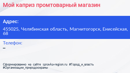 Мой каприз, промтоварный магазин по адресу 455025, Челябинская область, Магнитогорск, Енисейская, 68 в дальнейшем Организация, размещена в следующих категориях: