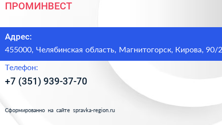 ПРОМИНВЕСТ по адресу 455000, Челябинская область, Магнитогорск, Кирова, 90/2 в дальнейшем Организация, размещена в следующих категориях:
