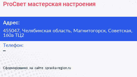ProСвет, мастерская настроения по адресу 455047, Челябинская область, Магнитогорск, Советская, 160а ТЦ2 в дальнейшем Организация, размещена в следующих категориях: